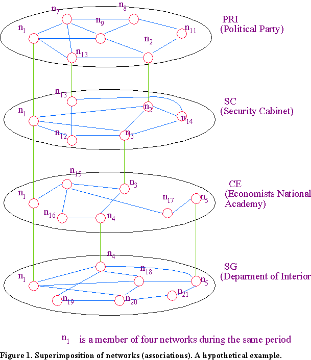 In this hypothetical case, one actor belongs to the ruling PRI party, to the Department of the Interior (this department belongs to the national security cabinet, which is another network) and also to a professional association for economists.