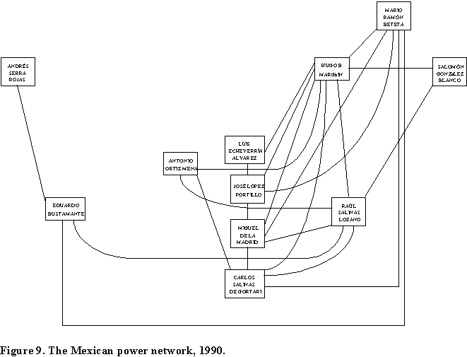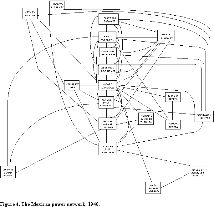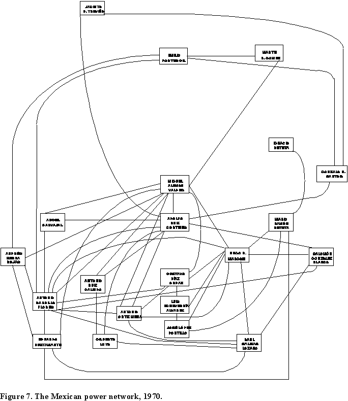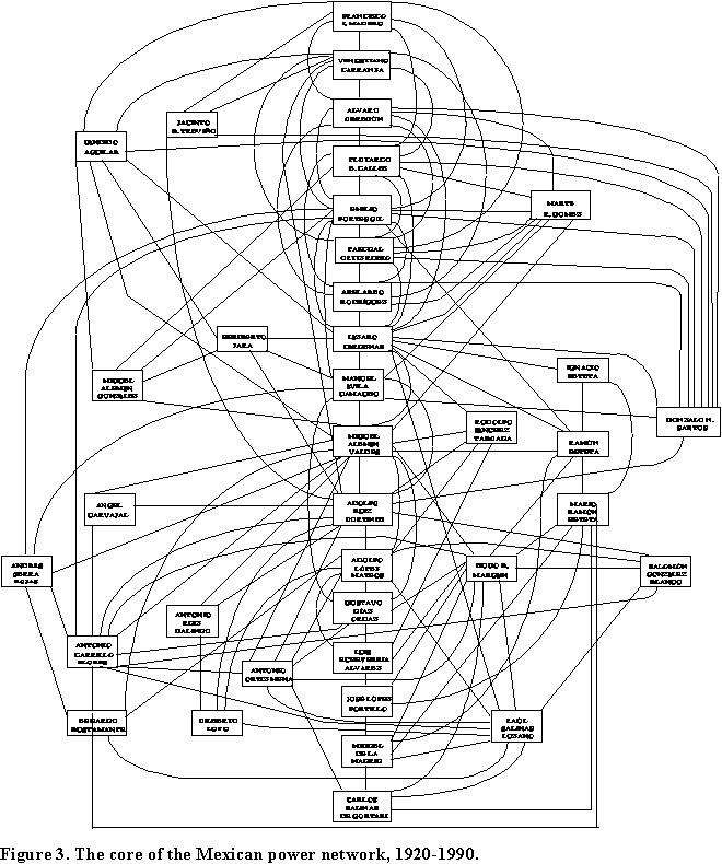 We have undertaken the project to understand the configuration, function and role of the Mexican network of power. Previous studies have focused on the recruitment and education of Mexican political leaders and rulers (Camp 1980), the path of their political careers (Smith 1979), their technical skills (Centeno 1994), the creation of cliques (Camp 1990) and the development of networks as an instrument for delivering benefits to their constituents (González-Matinez, 1995). It is our objective here to examine the network's topology, function and centrality values.