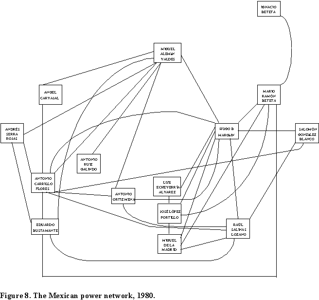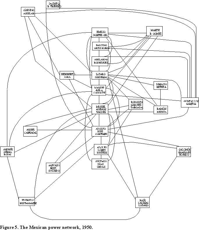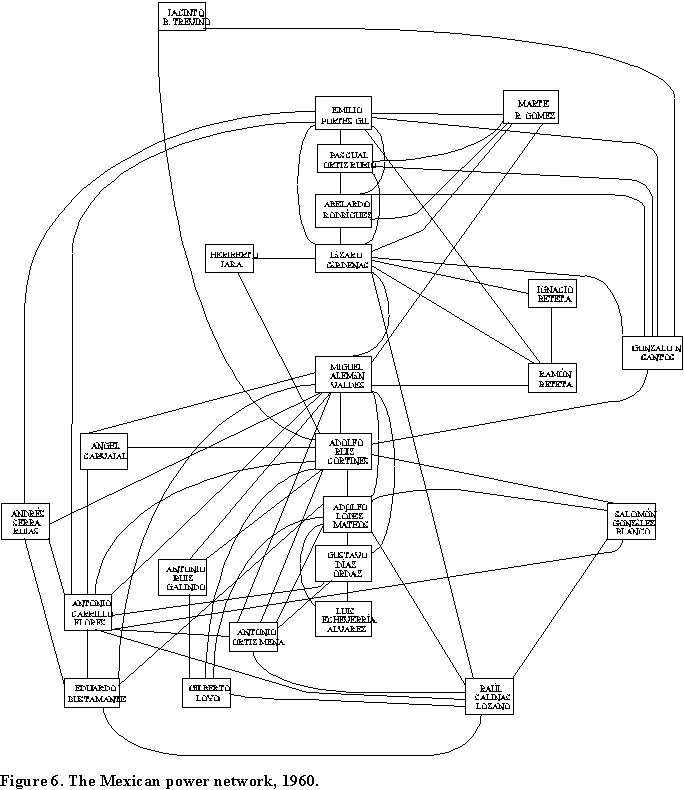 It is important for an actor to have connections with other cliques because the intersection of cliques facilitates the mobilization of multiple resources and can determine an actor's political career, even a solidifying a bid for the presidency, as we showed was the case of Ruiz Cortines, who became president in 1952 (Schmidt and Gil 1993). The intersections also explain the network's cohesion and why some groups remain in power for extended periods of time. Still, we have to assume that the disappearance of some actors and inclusion of others has to alter the intersections and redistribute influence and power.